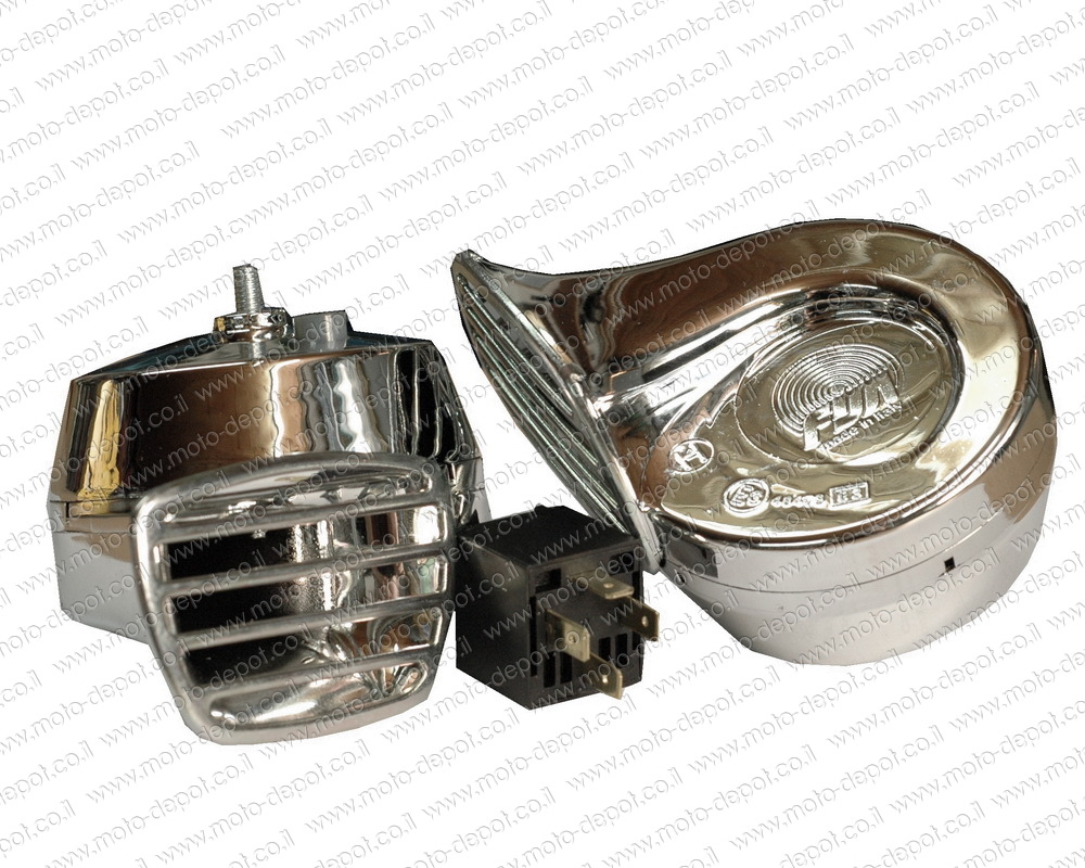 זוג צופרים צבע ניקל מלא, מתאימים לאופנועים וקטנועים עם מצבר 5A ומעלה. בא בסט עם ממסר חשמלי ועם פלטות חיבור. תוצרת איטליה.