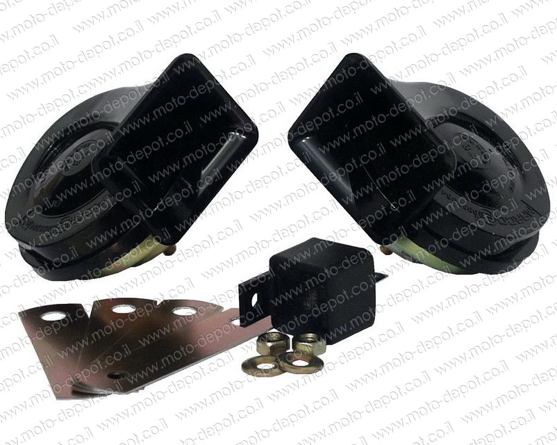 זוג צופרים 12V לאופנוע, קטנוע. באים בסט עם ממסר חשמלי ופלטות חיבור. תוצרת איטליה.
